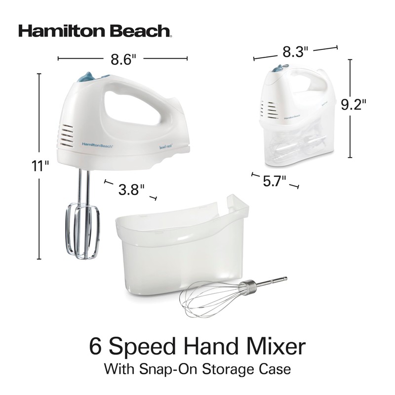 Hamilton Beach 6-Speed Electric Hand Mixer with Whisk, Traditional Beaters, Snap-On Storage Case, 250 Watts, White