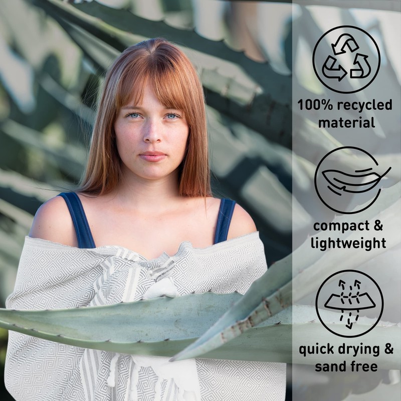 - ♻ RESOURCE-SAVING MANUFACTURING – Our Turkish hammam towel is made in Turkey from 100% recycled cotton. This drastically reduces water consumption and protects valuable cultivation areas.