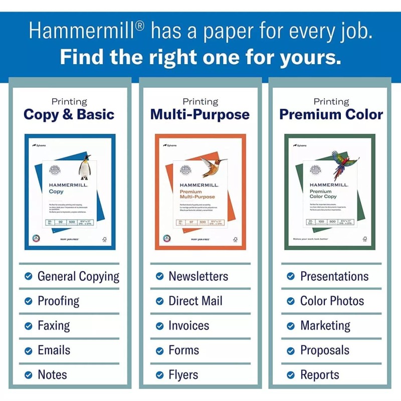 • OTHER PAPER OPTIONS – There’s a Hammermill print and copy paper for every purpose including premium presentation-quality color copy paper, cover-weight paper stock, glossy paper for photo printing, and 15 pastel shades of multipurpose copy paper.