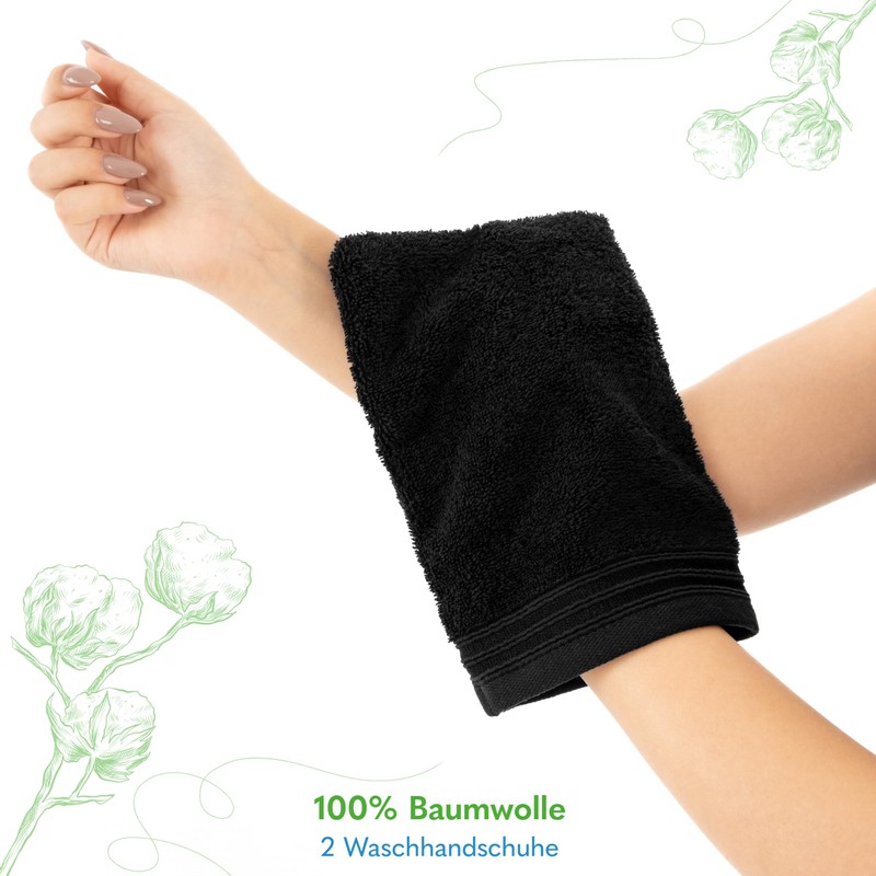 Hammetex Set of 2 Wash Mitts 15 x 22 cm, 100% Cotton with Wash Cloth, Terry Cloth, Super Fluffy Soft Quality, Durable, Black