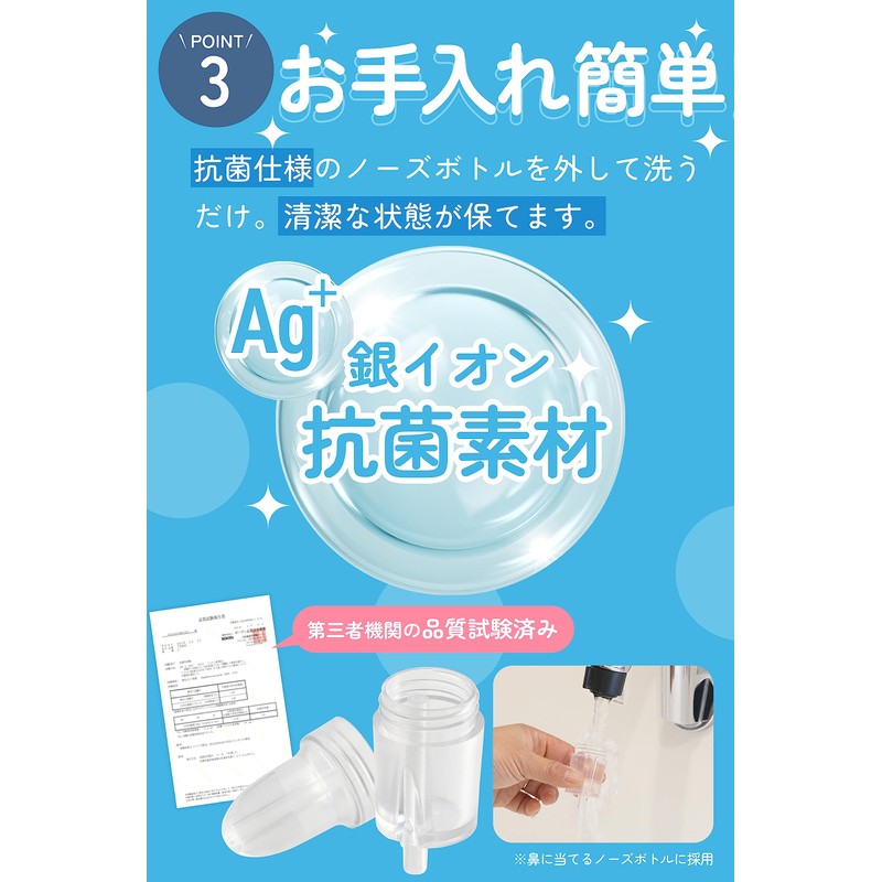 - ✅【Ag+銀イオンをノーズボトルに採用】簡単お手入れで、清潔・衛生を保つことができる子供用鼻水吸引器です。ノーズボトルにAg+銀イオンを使用しているため、微生物の繁殖を抑え、清潔な状態で赤ちゃんの鼻水吸引が可能です。しかも、ノーズボトルは取り外して水洗いできるのでお手入れも簡単です。