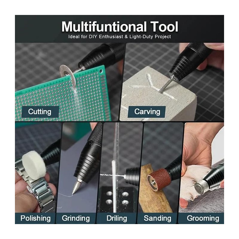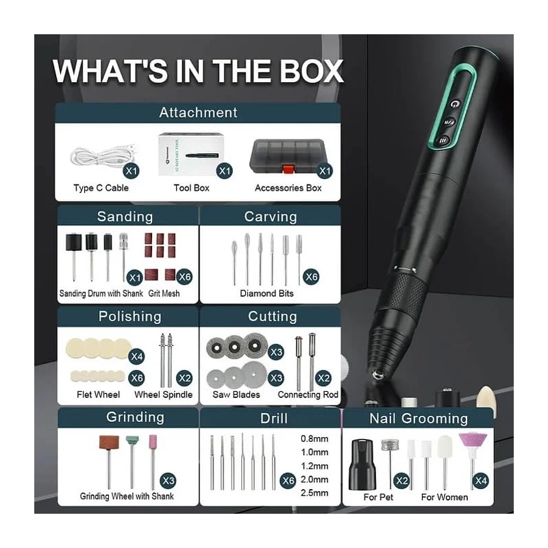 • COMPREHENSIVE KIT: Includes an extensive array of accessories with cutting wheels, polishing pads, sanding bands, drill bits, and a storage case