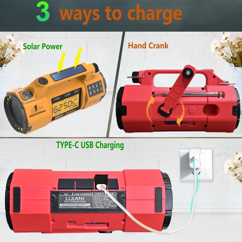 - Solar Power/Hand Crank/USB Type-C Charging for Any Crisis-Unlimited power when the grid fails! This solar powered radio with hand crank keeps running by solar power, hand crank emergency radio dynamo, or USB-A/Type-C charging. The 5000mAh battery backup charges phones and powers emergency radio functions. Includes super-bright 3-mode crank flashlight to cut through darkness. Your reliable survival gear and supplies