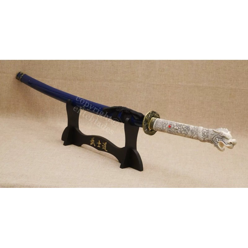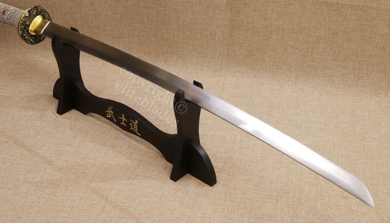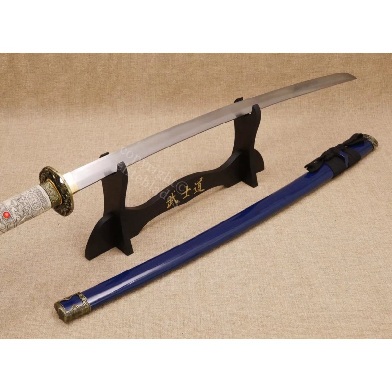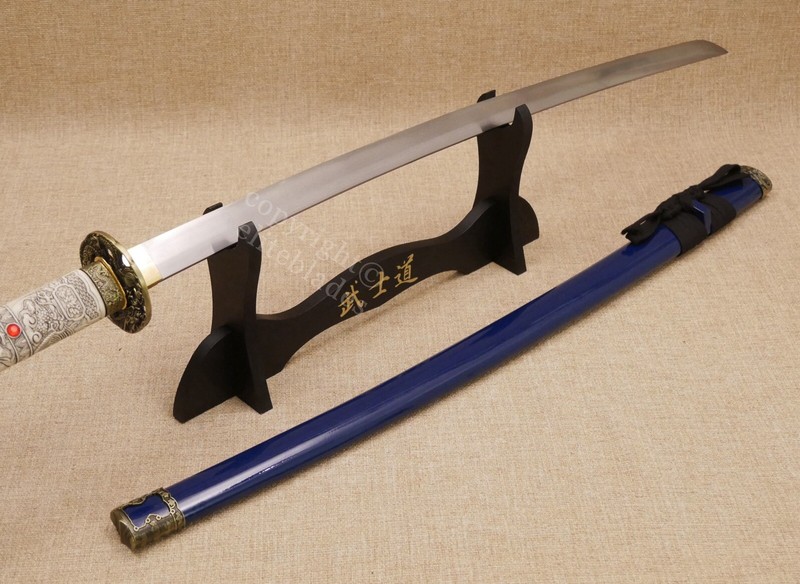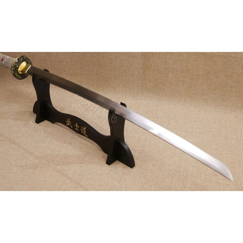 Manufactured by Musashi, and the sword is from their Musha series. Blade is traditionally hand forged (6-stage process) and heat tempered 1045 carbon steel. This is not a display piece but a fully functional sword that can be used for cutting exercises. Wood display stand is included. |
