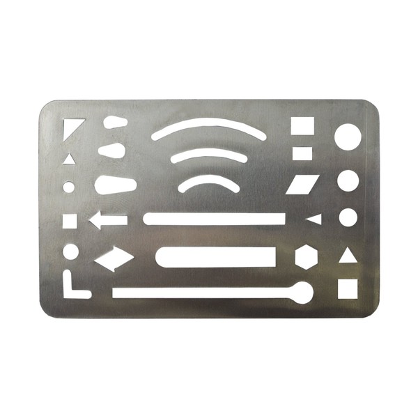 - Credit card sized metal template with a range of circle, square, polygon and other useful stencils.