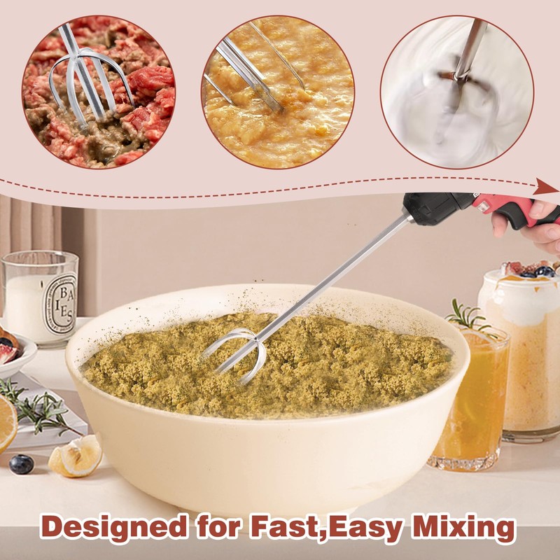 - More Powerful and Cost-Effective — Compared with ordinary mixers,the hand mixer beater is smaller in size and the connected drill rotates faster,allowing the task of mixing large quantities of ingredients to be completed in one go.
