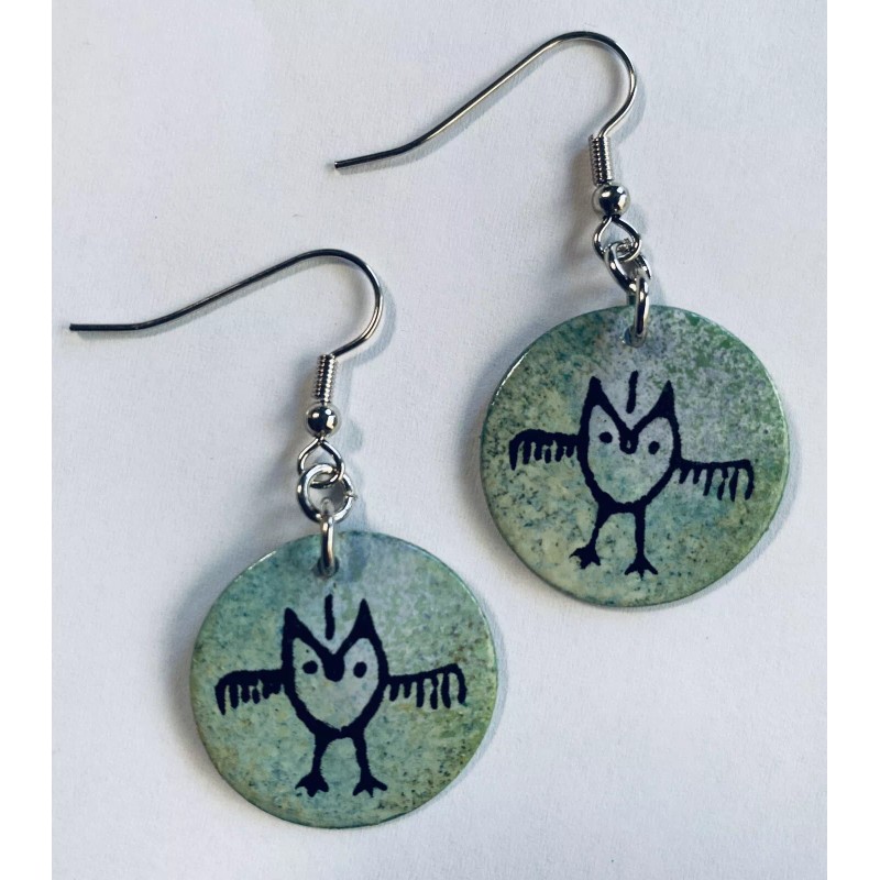 Hand Painted Pitroglyph Green Owl Sea Shell Earring