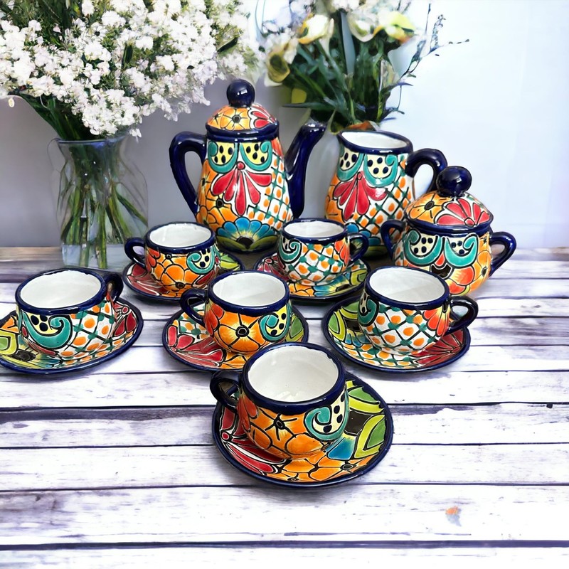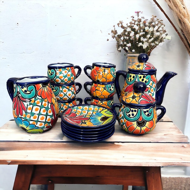 Handcrafted 15-Piece Talavera Tea Set - Mexican Ceramic Pottery