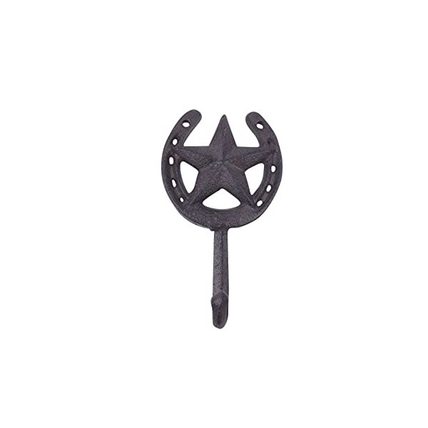 This Cast Iron Barn Star and Horseshoe Decorative Metal Wall Hook 7 inch is the perfect addition to any country living themed home. Ideal for hanging clothes and accessories, this durable barn star and horseshoe hook 7 inch is handcrafted from cast iron. Easily mountable, display this rustic decorative hook to show those who visit your home your affinity for the country living lifestyle.NOTE: Wall mounting hardware not included. Excellent horse decoration Solid and heavy - handcrafted from cast iron Classic vintage rustic appearance One functional hook ideal for hanging clothes and accessories Easily mountable (screws not included)