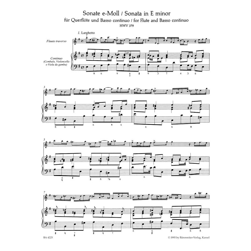 This beautifully presented set of eleven sonatas by Handel is one of the Barenreiter Urtext editions. It features an arrangement for Flute and Basso Continuo as well as a full realisation of Continuomaterial for a Keyboard instrument. Incluye 11 Sonatas originales para Flauta y Bajo continuo: Vorwort Zur Edition Preface Editorial Note Sonate e-Moll für Querflöte und Basso continuo / Sonatain E minor for Flute and Basso continuo (HWV 379) Sonate e-Moll für Querflöte und Basso continuo / Sonata in E minor for Flute and Basso continuo (HWV 359b) Sonate g-Moll für Blockflöte and Bassocontinuo / Sonata in G minor for Recorder ans Basso continuo (HWV 360) Sonate a-Moll für Blockflöte und Basso continuo / Sonata in A minor for Recorder and Basso continuo (HWV 362) Sonate G-Dur für Querflöte und Basso continuo / Sonata in G major for Flute and Basso continuo (HWV 363b) SonateC-Dur für Blockflöte und Basso continuo / Sonata in C major for Recorder and Basso continuo (HWV 365) Sonate h-Moll für Querflöte und Basso continuo / Sonata in B minor for Flute and Basso continuo (HWV 367b) Sonate F-Dur für Blöckflöte und Basso continuo / Sonata in F major for Recorder and Basso continuo (HWV 369) Anhang / Appendix: Drei Sonaten zweifelhafter Authentizität für Querflöte und Basso continuo / Three sonatas of doubtful authenticity for Flute and Basso continuo: Sonate a-Moll / Sonata in A minor (HWV 374) Sonate e-Moll / Sonata in E minor (HWV 375) Sonate h-Moll / Sonata in B minor (HWV 376)