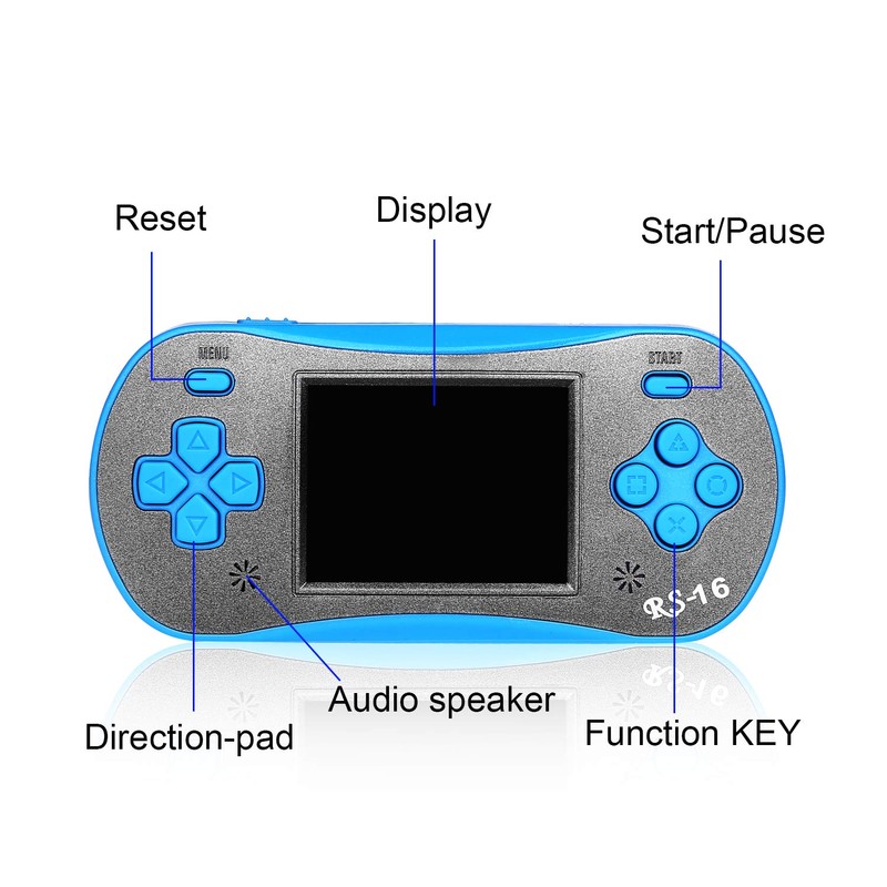 **RS-16 handheld console** When you are traveling, taking a coach or plane, this gaming device can ease the boring journey. In addition, when you are on vacation at home, you can use the included AV output cable to plug and play on the TV screen. 260 sets of independent copyright games, including: sports, puzzles, arcades, shooting, action, racing, strategy, card games, adventure and other high-definition games, so that children can learn and enjoy the joy of adventure in the game.