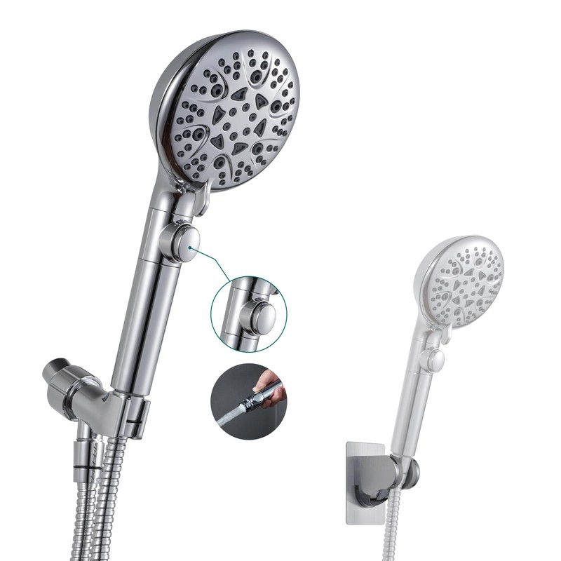 - 8 Modes + 2 Function Handheld Shower Head Set: The bathroom handheld showerhead features 7 spray modes and drizzle, as well as the powerful wash and stop button that can meet all needs of shower or wash at your bathroom. The high flow showerhead set with handheld includes the 4.5inch spray head, 79inch stainless steel hose, adjustable overhead bracket, low-reach adhesive shower holder and accessories like anti-leak Teflon tape and extra 2 washers.