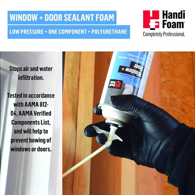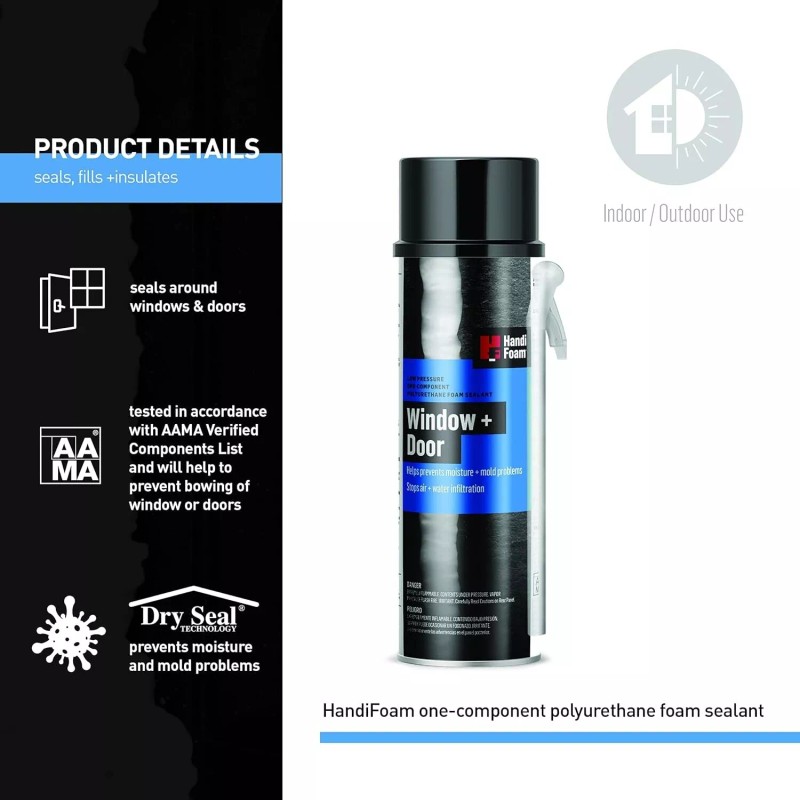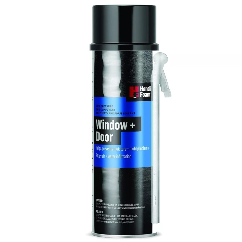 HandiFoam Window and Door one-component straw foam is moisture cured and designed to completely fill and seal small gaps around rough openings of windows and doors. Unlike many window and door foams on the market, HandiFoam expands 2-3 times the dispensed bead, but with minimal pressure to prevent window and door frames from bowing. For best results, only fill the void 1/3 full to allow for expansion. HandiFoam Window and door is tack-free in about five minutes, cuttable in approximately 1 hour and fully-cured in 24 hours. HandiFoam meets GreenGuard Gold approval. The product can be stored and re-used by simply cutting the cured tip from the straw dispenser.