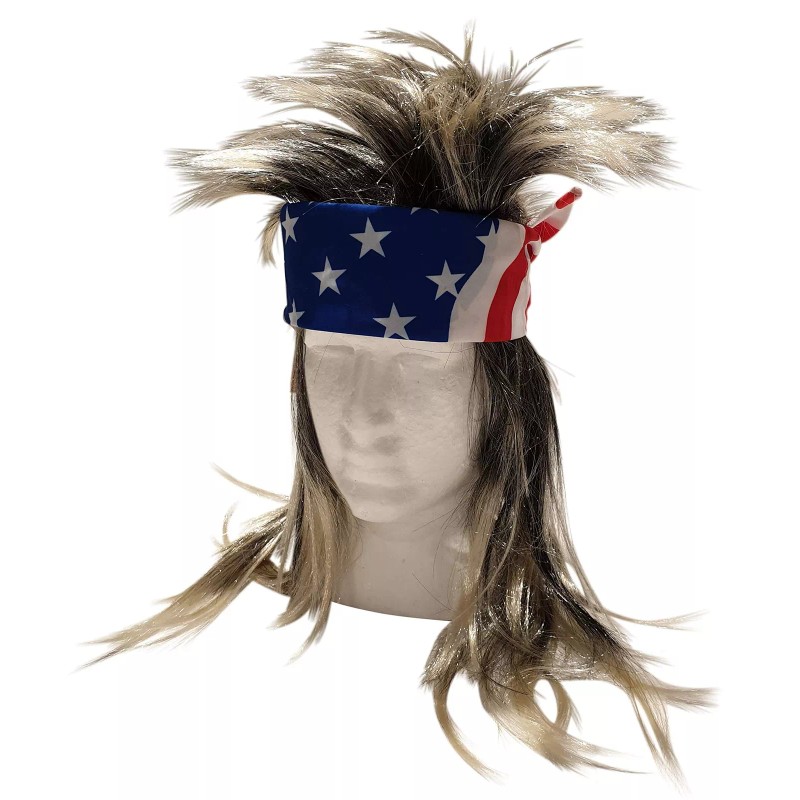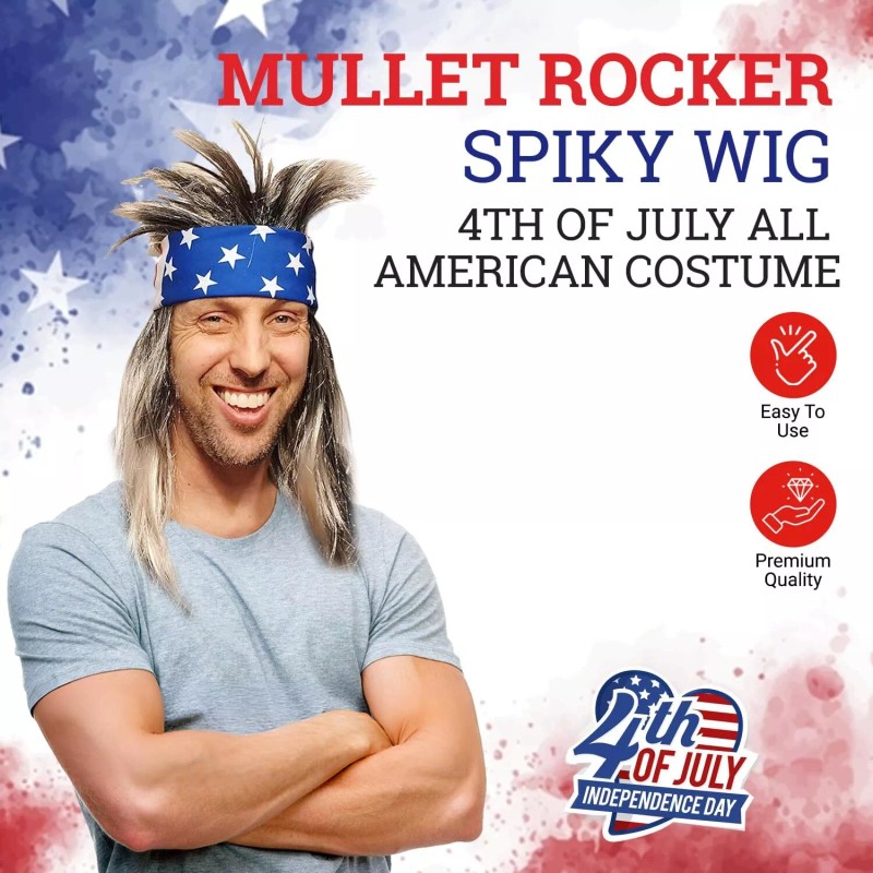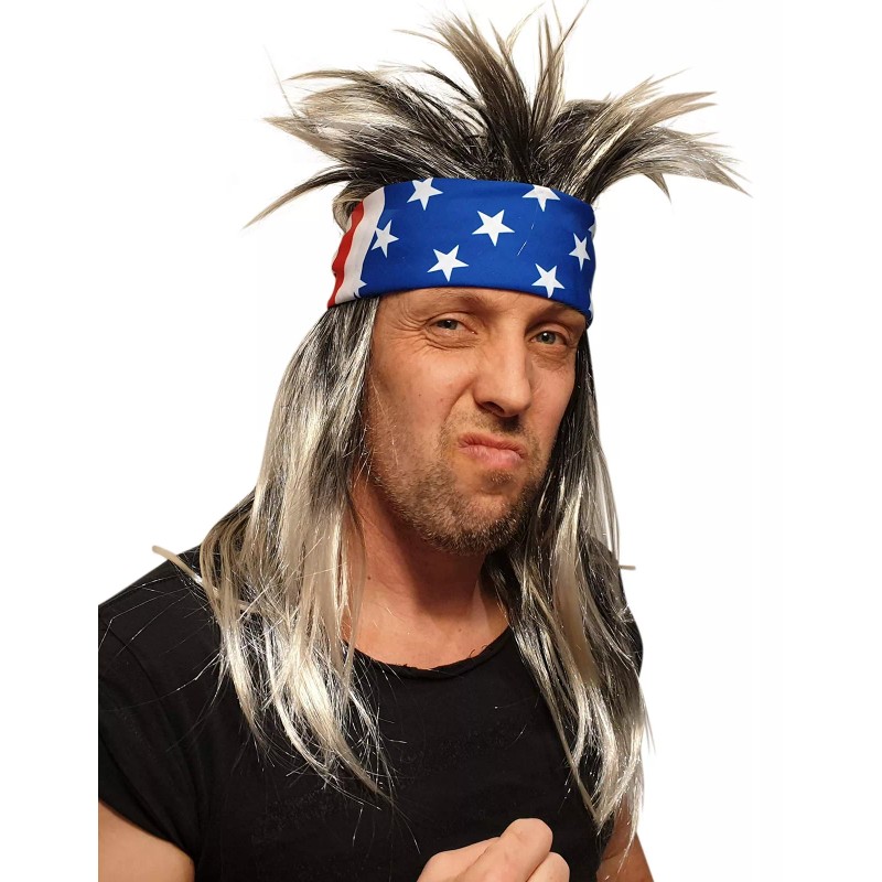 HandinHandCreations Mullet Rocker Spiky Wig with USA Bandana American Hippie Party Concert Costume Men and Women - One Size Fits All
