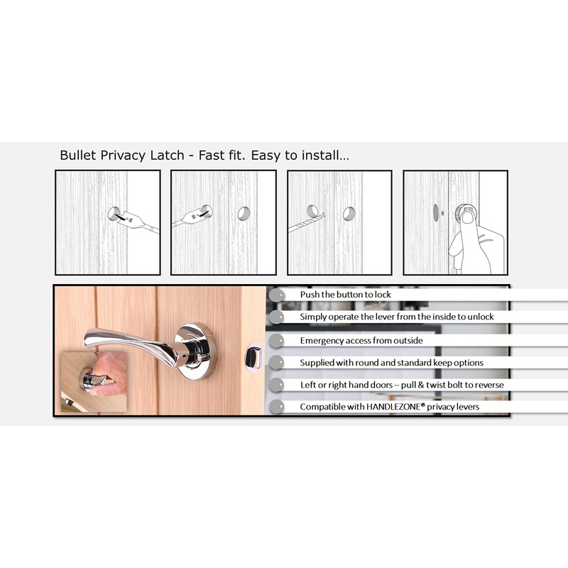 - CONTENTS: 1 set of Zena Designer Privacy Lever Handles on Round Rose. 1 x internal Bullet privacy door latch. Includes all fixings and matching screws