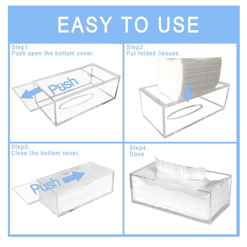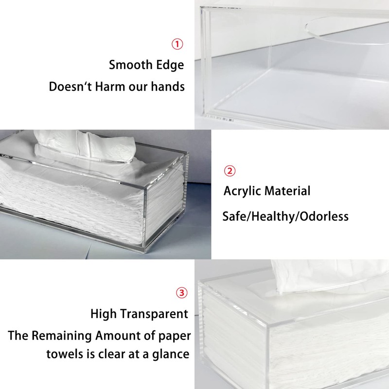 • Easy to refill: the acrylic tissue case comes with an extendable base, allows you to easily open the bottom cover, replace with a new box of tissues and slide the bottom cover back.