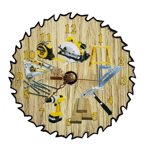 This clock measures 7 1/4” round and has a high gloss acrylic finish. The clock face features carpenter tools, saw, hammer, nails, tape measure, square, wood, drill, saw horses, and blueprints, . The clock mechanism has a built-in hanger on the back.