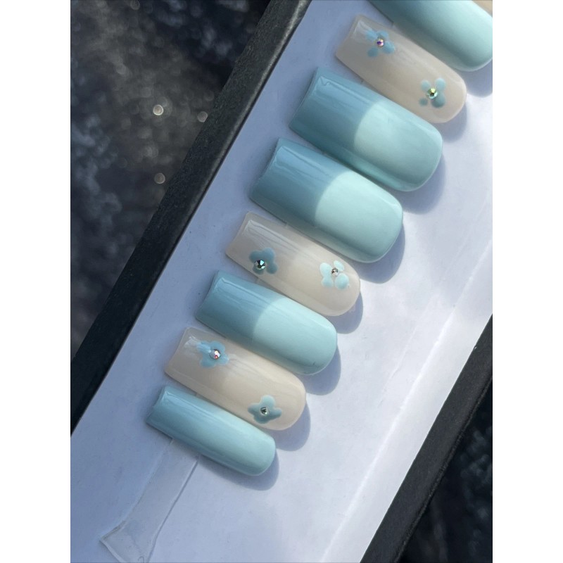 Handmade CUSTOM Gel Press On False Nails, BLUE W FLOWERS BLING, NEW 10p Set Med Square
