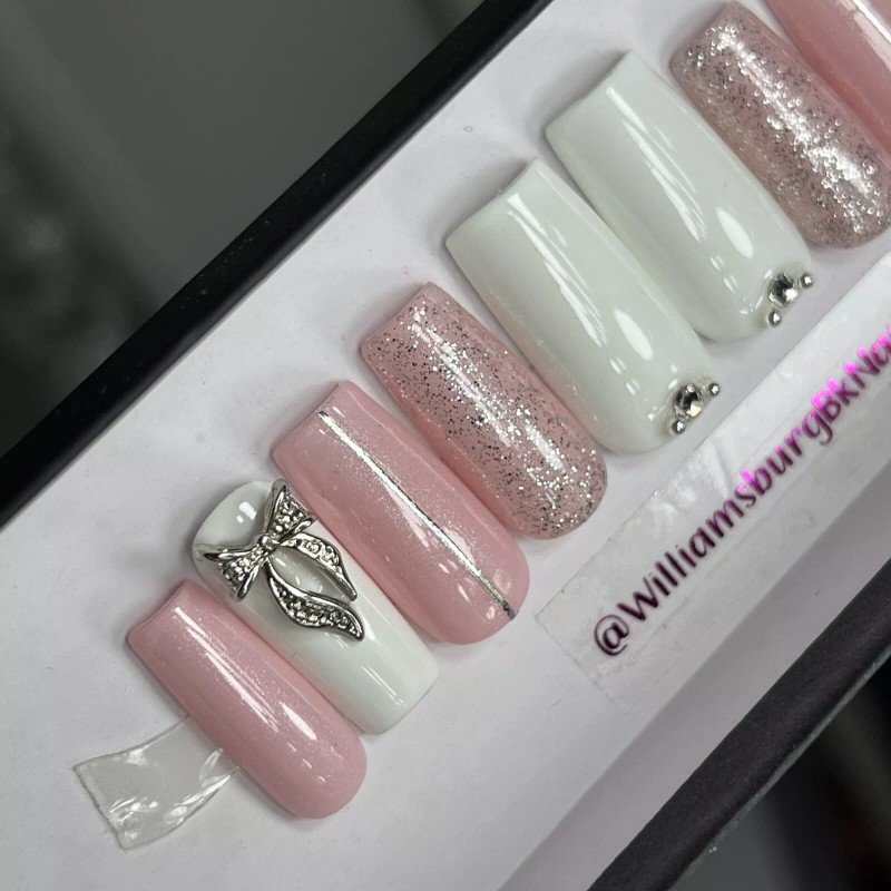 Handmade CUSTOM Gel Press On Nails, Pink BOW W/ Bling 10p set FULL SET W Kit
