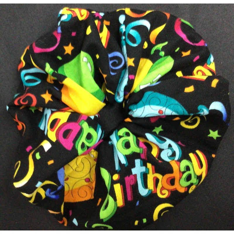 Handmade Happy Birthday Multi Color on Black Party Scrunchie Hair Tie - cotton - 6 inches