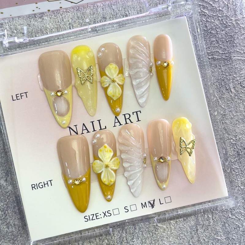 Handmade Press-On Nails, French Tip Press-On Nails Handcrafted 3D Floral Almond Nails Reusable Hand-Painted Design Nails Including Tool Kit, 10 Pieces (SHN35-S, S)