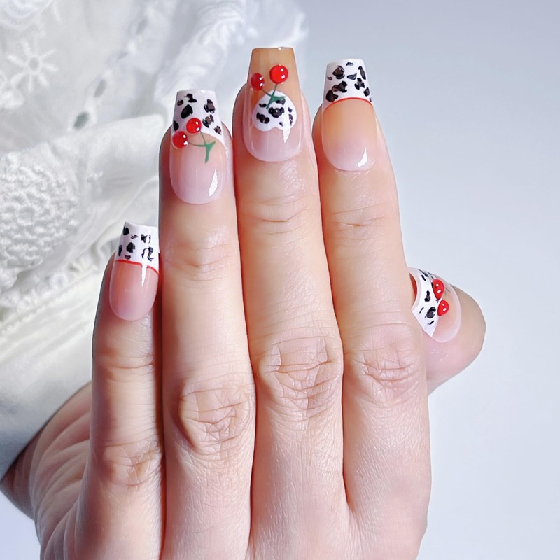 Handmade Press-On Nails, French Tip Press-On Nails, Handcrafted Leopard Print Short Coffin Nails with 3D Cherry Design, Reusable Hand-Painted Nails, Including Tool Kit, 10 Pieces (SHN5-M, M)