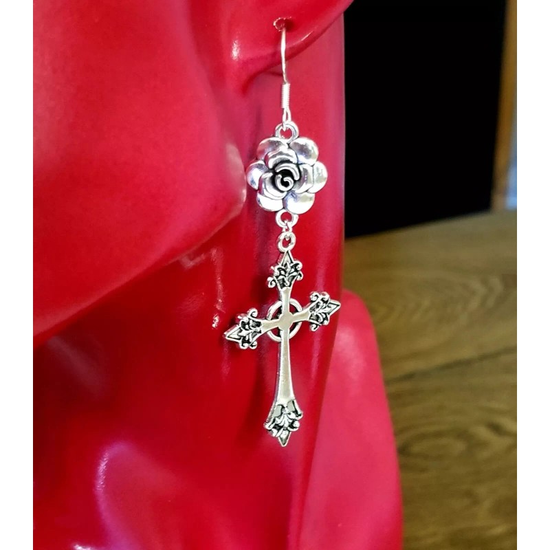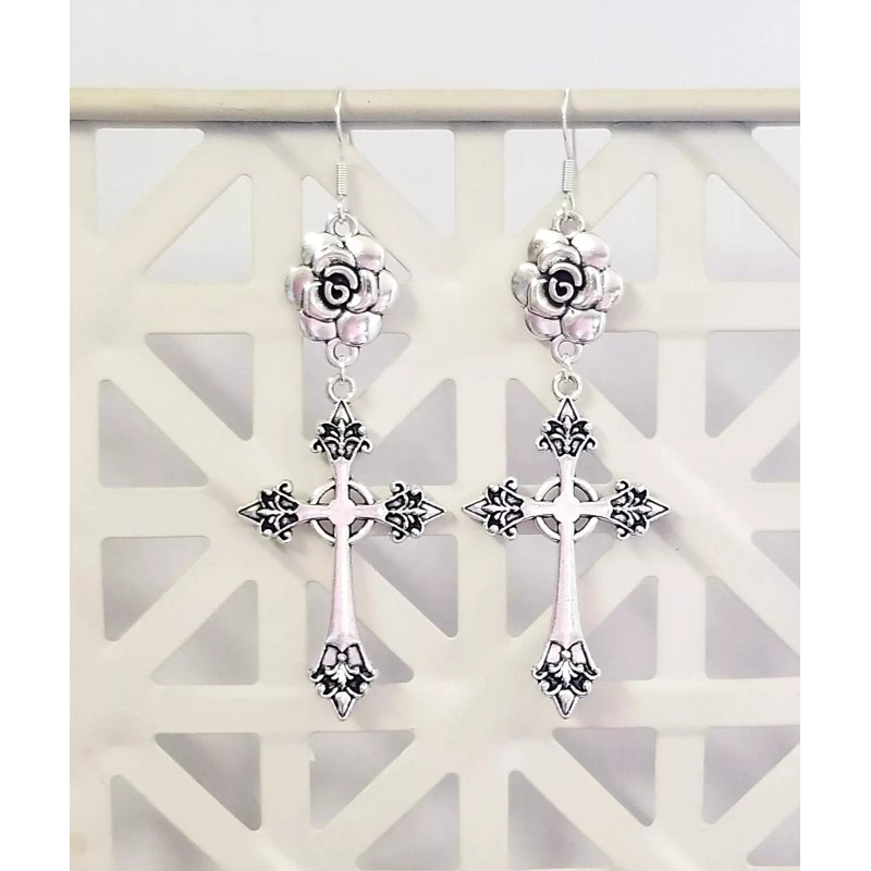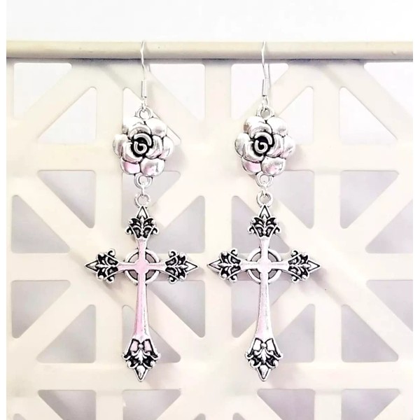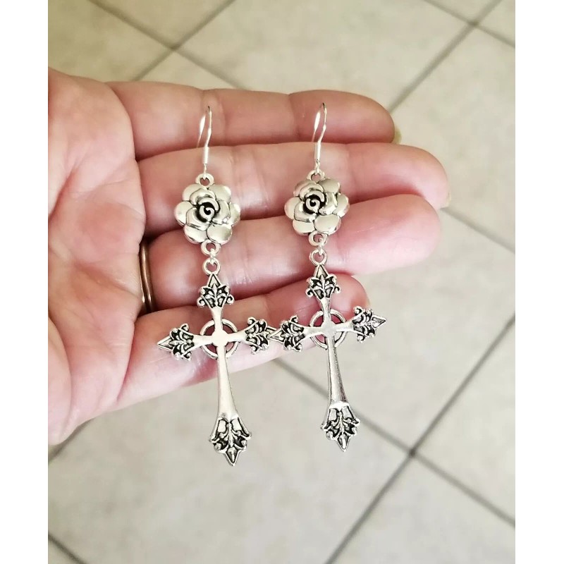 Handmade Rose Cross Earrings, Large Cross Earrings, Sterling Silver Cross Earrings Dangle