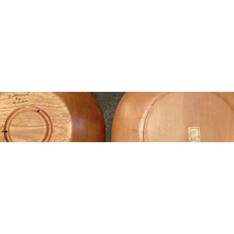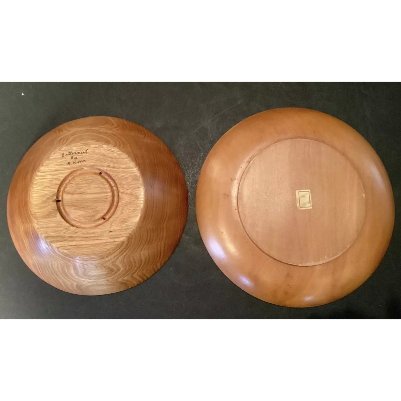 * the fourth item is a lift dish also hand turned wood. This does not have markings as to the artist or the type of wood and this dish measures 8 1/4 inches in diameter with the base being 5 inches in diameter.