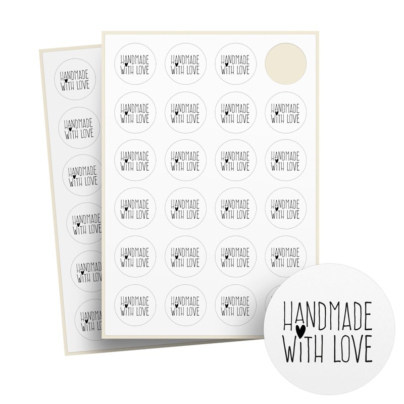 Handmade with Love Stickers, Pack of 48 on Sheet, Recycled Paper, Round, Diameter 4 cm, as Stickers or Labels for Wedding, Christmas, Handmade, Jams, Candles - Small Heart