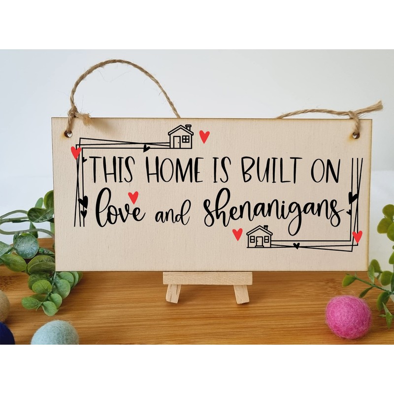 Handmade Wooden Hanging Wall Plaque Home Built on Love and Shenanigans Fun Sentimental Decorative Sign Family