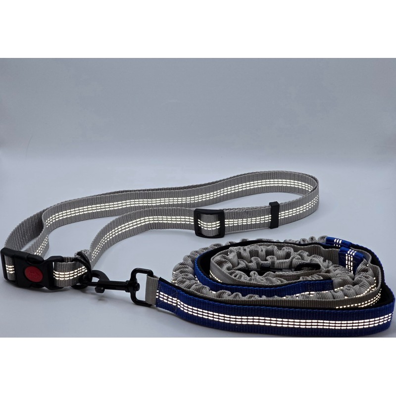 Hands Free Dog Leash with Adjustable Waist Belt, Dual Padded Handles, Elastic Bungee Ropes for Small to Large Dogs, Reflective Stitches for Walking, Hiking, Running and Biking. (Gray and Blue, Large)