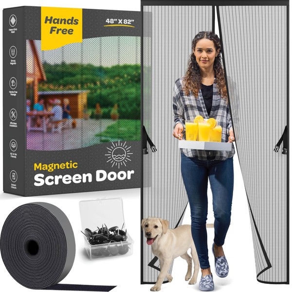 Hands-Free Magnetic Screen Door, Heavy Duty, Self Sealing Screen Door Mesh Protector, Pet and Kid-Friendly, Stay-Open Buckle, Keeps Bugs Out While Letting Nature in, Fits Door Size (48" x 82")
