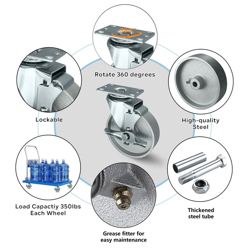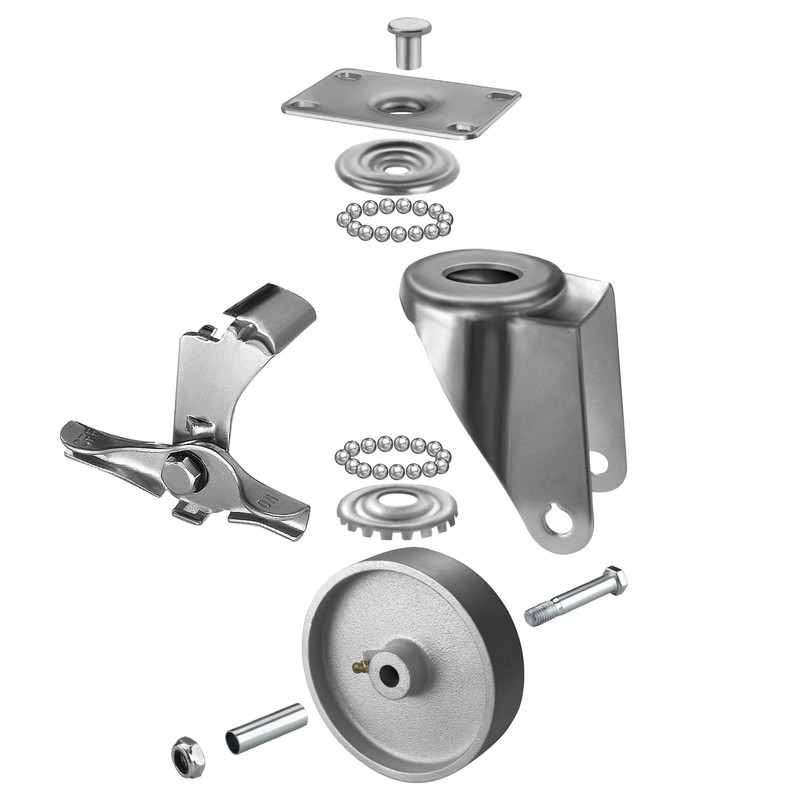 - CASTER FEATURE: The Steel casters contains two ball bearings, which can rotate freely and is shock resistant. The Caster Wheels are specially engineered to withstand harsh chemical environments and are resistant to greases, blood, oils, brine, solvents, and water including wash down applications.
