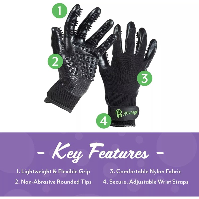 Revolutionize your grooming routine with HandsOn Gloves, designed to make grooming, shedding, bathing, and massaging easier than ever. Whether you're dealing with a horse, dog, or cat, these versatile gloves provide a comfortable, efficient solution to all your pet care needs. With their patented five-finger design, you'll reach every spot while keeping your hands clean and your pet relaxed. The gentle, flexible rubber tips effectively remove dirt, excess hair, and tangles, while also distributing natural oils for a shiny, healthy coat.