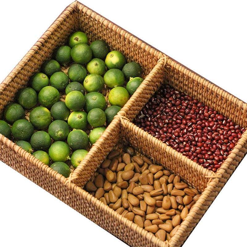 i-lan Woven Natural Rattan 3 Compartments Rectangle Cosmetics Storage Organizer|Wicker Utensil and Bottle Serving Basket for Fruit,Candy
