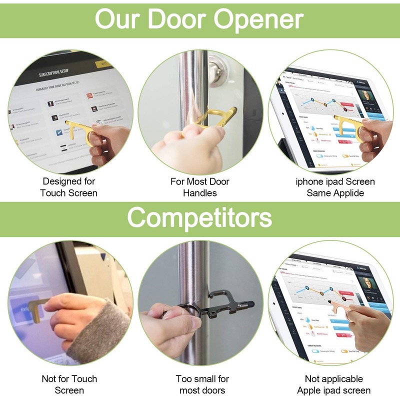 **When it comes your health and comfort, there’s no room for compromise. That’s why we have chosen to work only with top quality materials and verified suppliers, which are guaranteed to deliver to our high expectations. If by some reason you’re not entirely pleased with your purchase, our customer care department has got you covered!** **Why is this product for you?** ✔ No Touch at all - **Real contactless door opener** With this **keychain tool** , you no longer have to touch any door handle, keypad or touchscreen outside. ✔Real keychain stylus Different with others, our door opener tool has built in real stylus, there is a rubber tip on the top which makes it perfectly work on any touchscreen such as mobile, ATM, signature pad and more. ✔For everyone This **no touch keychain tool** is great for everyone: Men, Women, Kids, Dads, Moms. ✔Best Holiday Gifts This **hands free door opener** is also great gifts for your family and friends, Let your loved person stay safe and health.very nice and useful gadget :-) **What you will get** Door opener keychain tool x4 Spare stylus tip x4 **Warm Tips:** When you replace the touch screen stylus tips, please align the holes first, and then rotate it slowly, so that you can easily replace the touch screen stylus tips, which is very convenient and can't easily fall off.