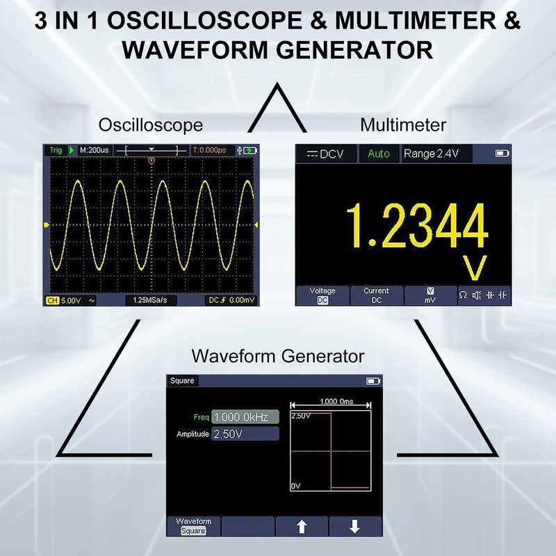 - Three-in-One Functionality C Combines an oscilloscope, multimeter, and signal generator in one compact device, making it ideal for electronics troubleshooting and testing.