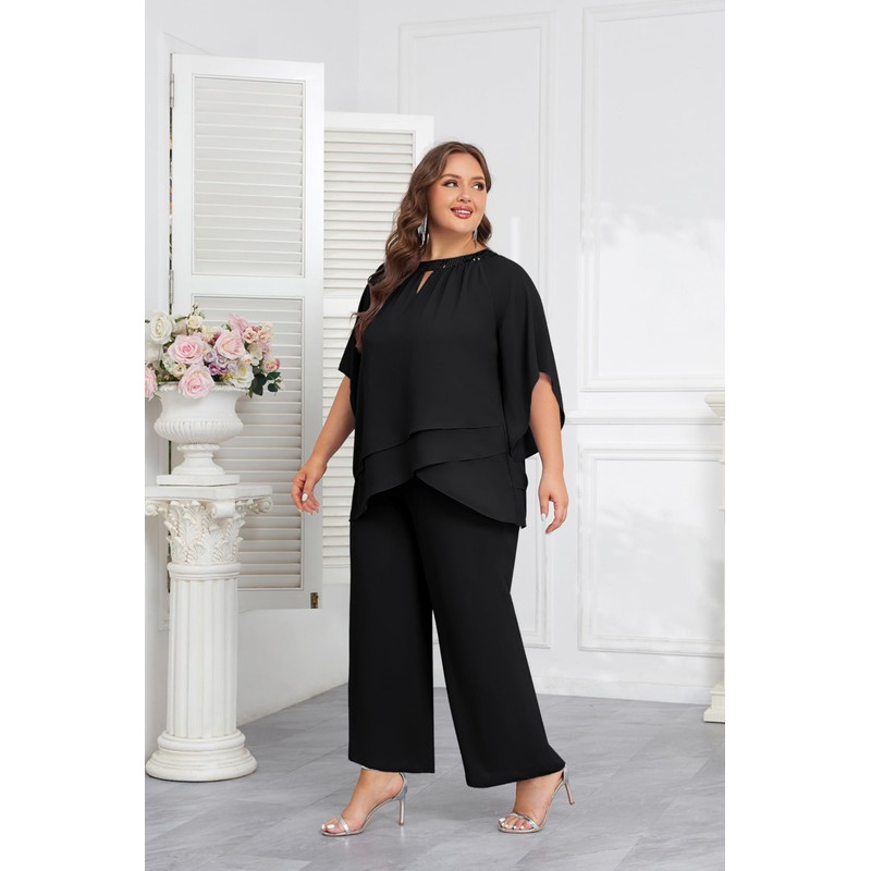 - Feature: Plus size wedding guest pantsuit features in crew neck with sequin that making you look even more sparkly in the crowd., 3/4 chiffon sleeve. The pants are lined so dont't worry see through.