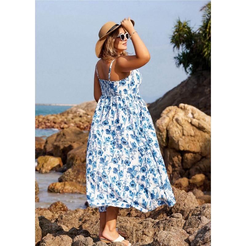 Hanna Nikole Women Sundress with Adjustable Spaghetti Straps Smocked Back Elegant Ruched Bust Dress 18 Plus Blue Flower