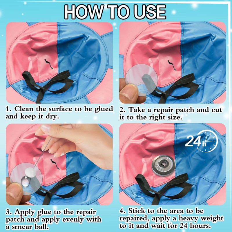 - Our inflatable patch repair kit is incredibly easy to use. Simply clean the surface to be glued and keep it dry, evenly apply the adhesive