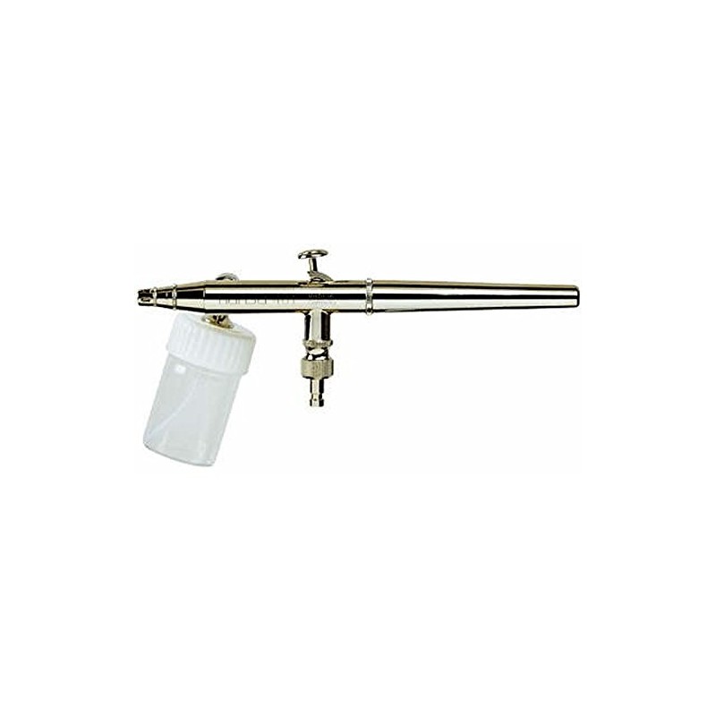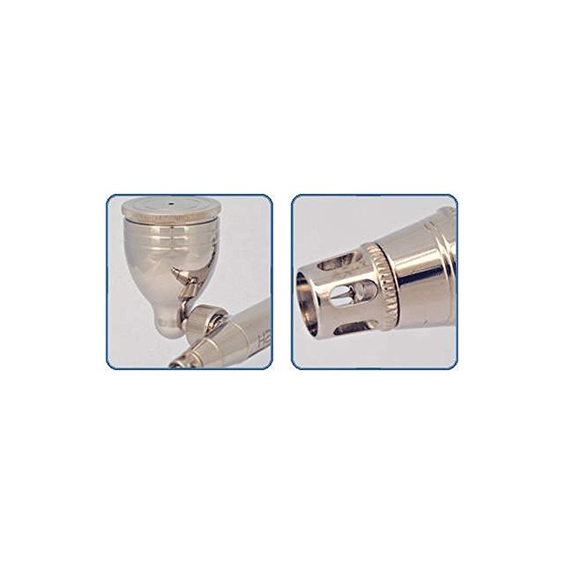 Airbrush set with side connection with 7 ml flow cup (with lid) upwards and side connection set with two glass cups (15 ml), socket system 0.3 mm, can be converted to 0.2 and 0.4 mm. Variable and universally applicable for all areas. 'The optimal set for the model maker'.