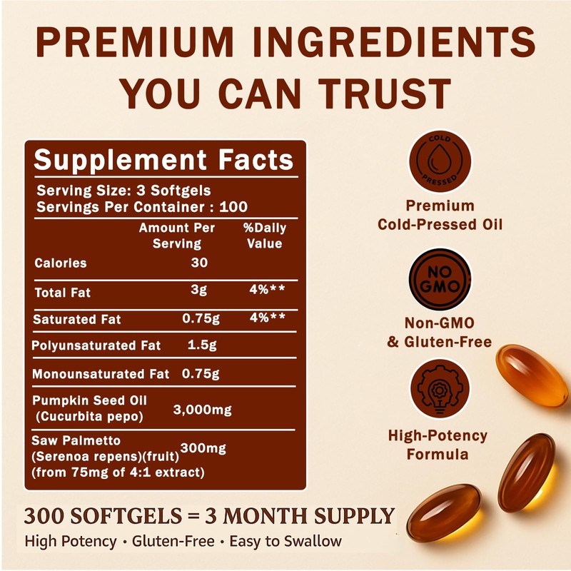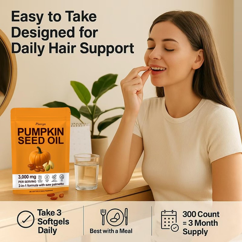 HANSODAP Pumpkin Seed Oil for Hair Growth – 2-in-1 Formula with Saw Palmetto – 3000mg Organic Cold-Pressed Pumpkin Seed Oil per Serving – Non-GMO and Gluten Free – 300 Softgels