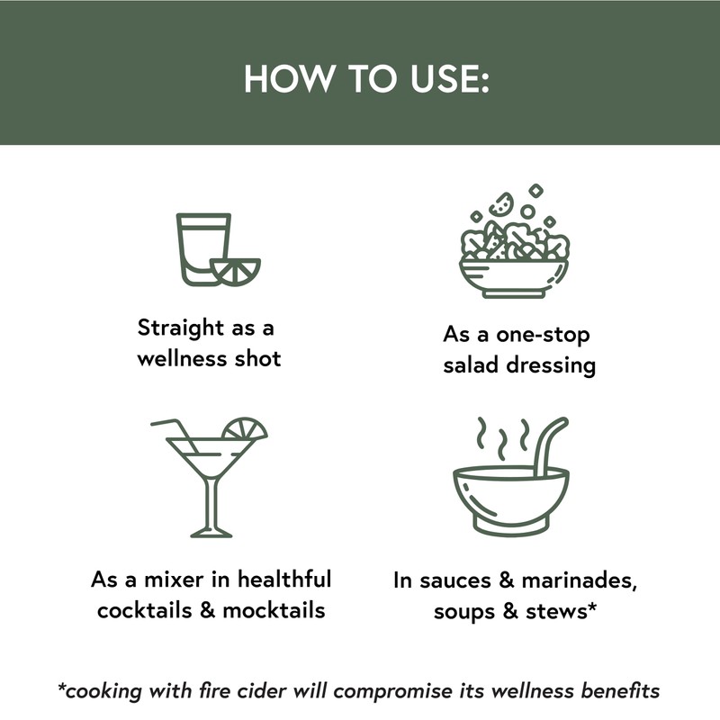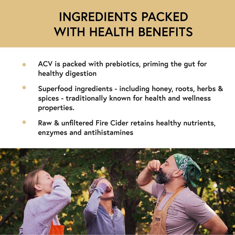 - Ingredients: organic raw unfiltered apple cider vinegar, organic lemon Juice, Grade A dark maple syrup, raw wildflower honey, organic lemon juice, organic yellow onion, organic garlic, organic ginger root, horseradish root, organic turmeric root, organic rose hips, organic orange peel and cayenne pepper