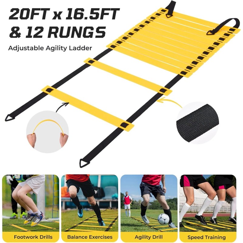 - Complete Training Set: Customize your training experience with our comprehensive training set. Our package includes a 20-foot adjustable ladder with 12 rungs and 12 sports cones, allowing you to engage in diversified soccer training. Improve your footwork, balance, agility, and coordination while enhancing your overall performance.