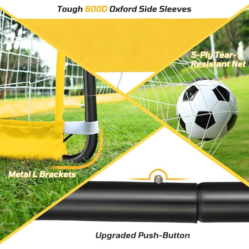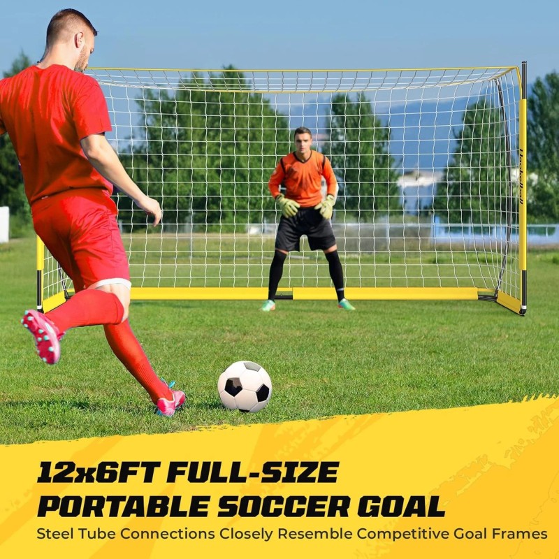 - More Fun with Large Size: The 12'x6' soccer goal features 5-ply tear-resistant polyester knotless netting and 600D Oxford fabric sleeves for enhanced longevity. Its generous size allows for comprehensive skill practice to hone different soccer techniques. Unlike inferior fiberglass goal posts on the market, we employ upgraded steel support posts capable of withstanding heavy impacts without any deformation. This results in a rectangular shape goal that delivers an authentic soccer experience.