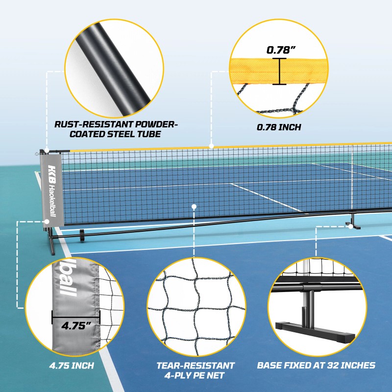 - Net Height: volleyball (7'4"), badminton (5'1"), and pickleball (36")