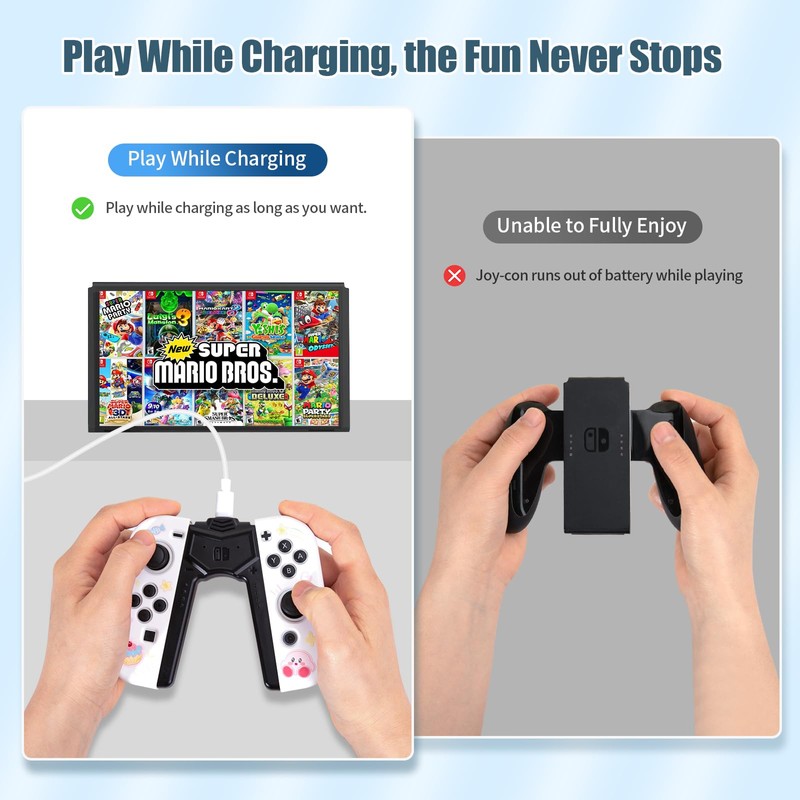 • Ergonomic Design: Featuring a sleek and sturdy construction, this grip provides a comfortable and secure hold for your Joy-Con controllers.