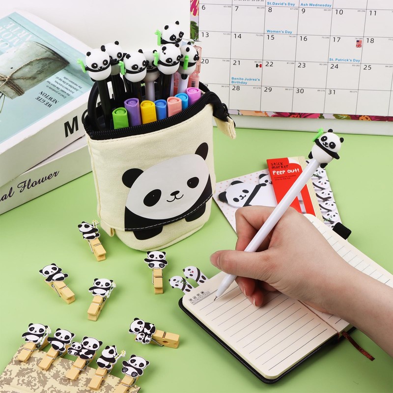 HAOWANWW 21 Pcs Panda Standing Pencil Case Set 8 Pcs Panda Pens Panda Pencil Pouch Case Panda Notepad Panda Stickers 10 Pcs Cute Wooden Panda Clips Panda Gifts for Girls Office School Supplies