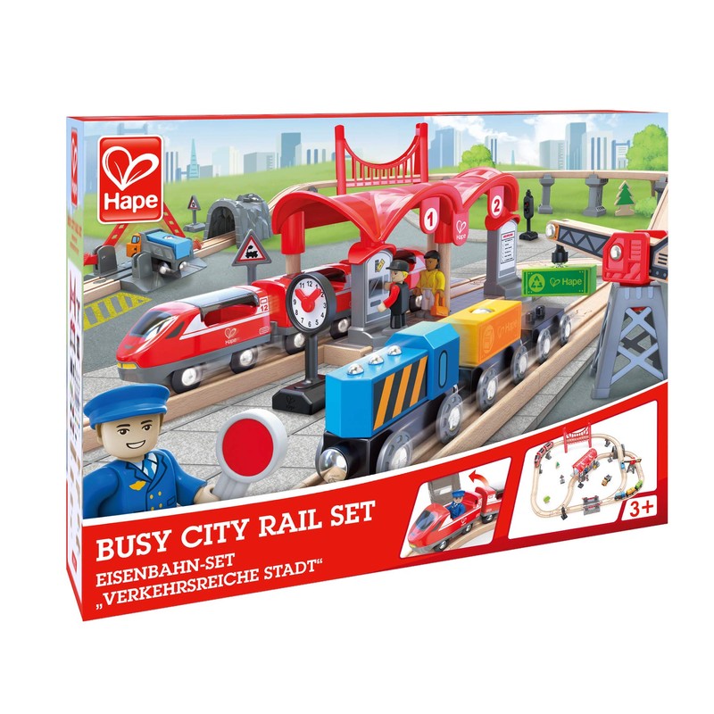 station managing and bonding time. Setting up the train set is a great way to strengthen your bond with your child as you work together. Watch them learn and light up as they figure out the different ways in which they can piece together their ideal rail set. Train tracks aren’t just for passenger trains. There’s freight to deliver, too! This complete city-themed railway set features a passenger train and a freight train, a station, automatic gates and a bridge. Also included are three play figurines with accessories, a tipper truck and more. Detailed Train Set FeaturesThe freight train has two carriages with removable containers The automatic gates can be opened and shut to prevent accidents Tipper truck has a moveable tipper Includes safety signs and an adjustable railway signal The realistic crane has a magnetic hoist for moving cargoHape Busy City Railway Set Finishes & Materials This train set is perfect for children aged 3 and older. This product is durable and child safe, it contains water-based paint and has non-toxic finishes. This product has been designed to last for years to come