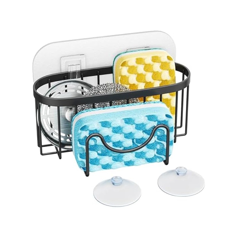 HapiRm Multifunctional Sponge Holder with Unique M-Shaped, 2 Installation Methods Kitchen Sink Caddy Organizer, Rustproof Stainless Steel Sponge Caddy for Brush, Sink Stopper and Scraper -Black